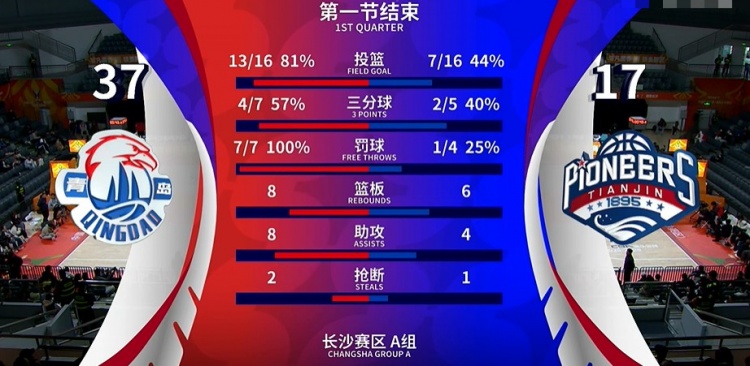 一节花!青岛攻防压制天津 首节37-17领先20分