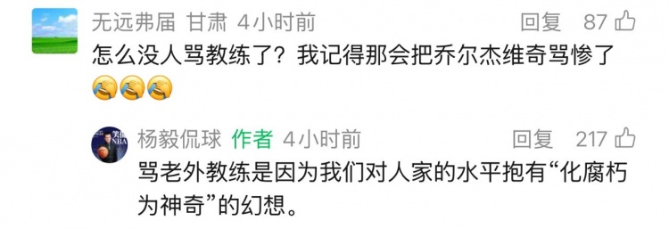 186体育12月2日讯 杨毅侃球公众号今天发文,谈到了中国男篮世预赛对阵韩国男篮的两场失利。 在本文的评论区,有网友表示:“怎么没人骂教练了?我记得那会把乔尔杰维奇骂惨了。” 对此杨毅侃球公众号回复:“骂老外教练是因为我们对人家的水平抱有‘化腐朽为神奇’的幻想。”